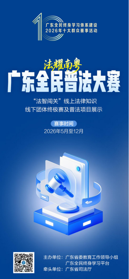 请登录广东全民终身学习平台“十大群众赛事活动”专区、“广东普法”微信公众号报名。赛事报名、参与、赞助等事宜咨询,请联系:陈泽铭020-86351339。