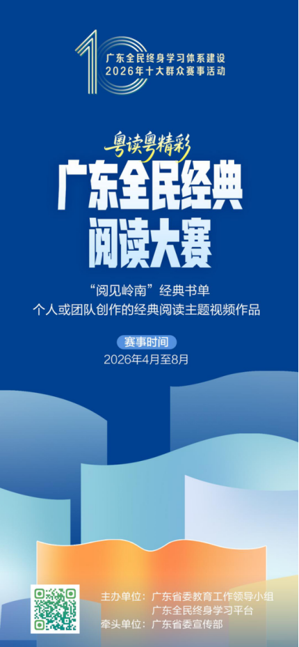 广东全民经典阅读大赛是全省首次围绕经典读物举办的阅读大赛。赛事以“粤读粤精彩”为主题,发布“阅见岭南”书单,涵盖岭南文化、经典文学、历史人物、地域发展等多元经典读物。参赛作品以视频方式展现(包括但不限于诵读讲书、情景剧演绎、歌舞童谣等创新方式),将经典阅读从个人修为升华为社会共享的文化实践。