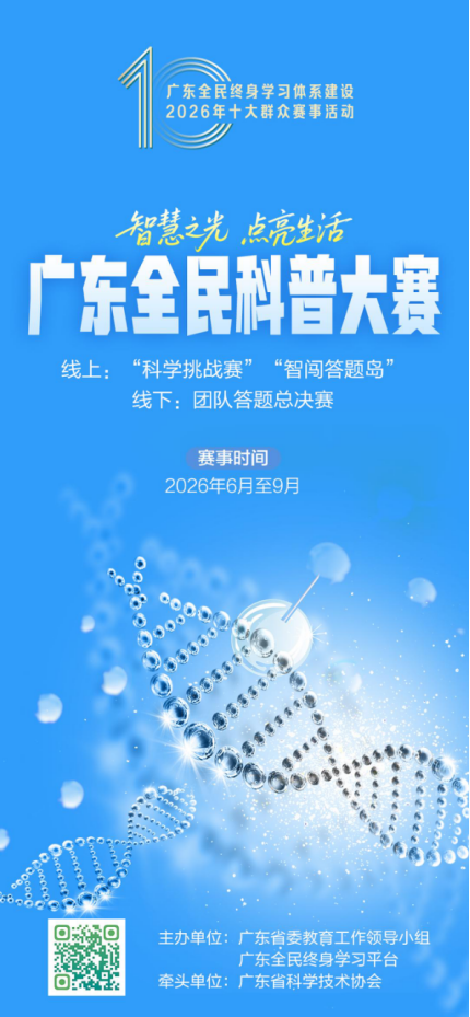 广东全民科普大赛是全省覆盖范围最广、参与人数最多的综合性科普赛事,旨在弘扬科学精神、共建共享科普资源、提升全民科学素质。一是主题鲜明,聚焦以高质量科普服务经济社会高质量发展。二是题库多元,既有人工智能、量子科学,也有生活百科、应急避险等,兼具生活性与前沿性,总题量超过7万道。三是创新争先,线上线下相结合,省市县三级联动、比学赶超,实现“以赛促学、以赛促用、学用相长”。