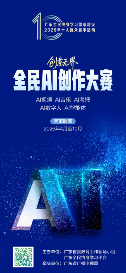 全民AI创作大赛为国内首个无门槛、全开放、产学研资融合的全民AI创作赛事,以AI技术普及为抓手,设AI视频、AI音乐、AI海报、AI数字人、AI智能体五大赛道,鼓励不同群体使用前沿AI工具进行岭南文化等主题创作,让数字技术真正服务于全民终身学习。