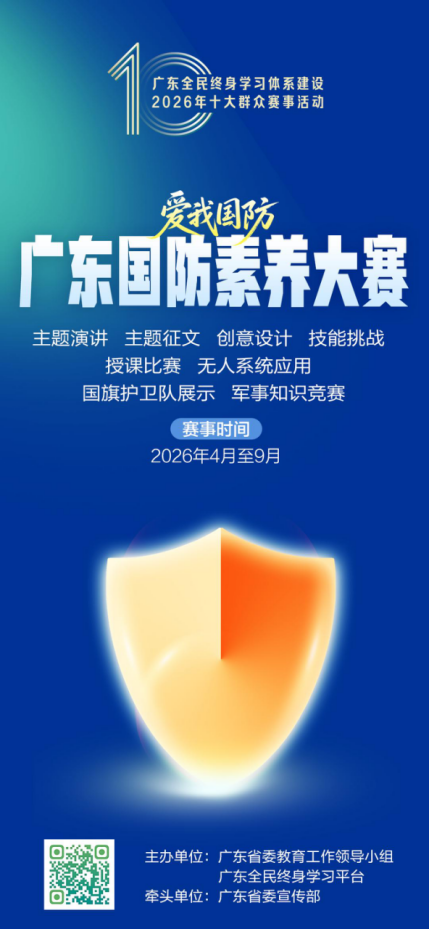 请登录广东全民终身学习平台“十大群众赛事活动”专区和南方+、羊城派“广东国防素养大赛”专题报名。赛事报名、参与等事宜咨询,请联系:谢艺婷020-87133533。