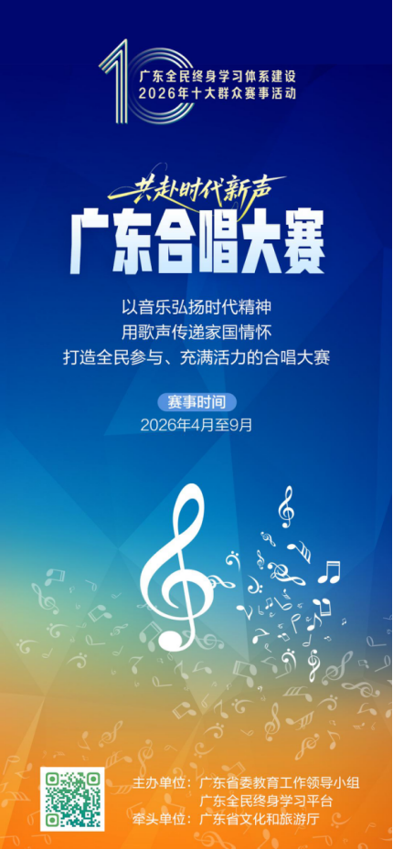 广东合唱大赛是一项覆盖全省、深具影响力的群众文艺赛事,分为成人组和少儿组,包括初选、复评、决赛3个阶段,并将举办优秀节目展演和颁奖晚会。一是以赛促学,将合唱赛事融入“全民终身学习”生态,将赛场延伸为“没有围墙的音乐课堂”。二是以文化人,通过演唱广东特色及经典红色作品,引导群众在歌声中感悟家国情怀、深化文化认同。三是以艺育人,借助多元化的曲目库提升公众的艺术鉴赏力与表现力,培育积极健康的审美风尚。